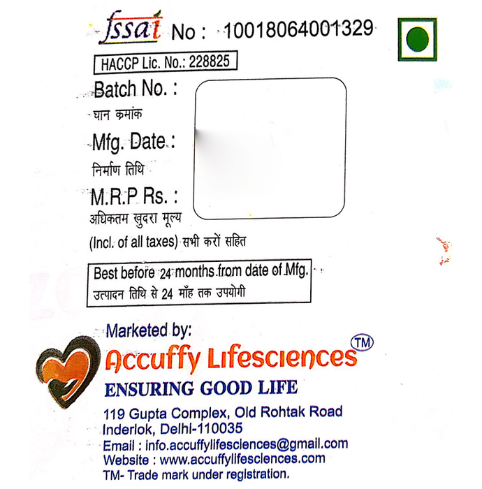 Manufacturer details:,                                   Marketer details:Accuffy Lifesciences | 119 Inderlok Gupta Complex, Old Rohtak Road, Delhi-110035, India