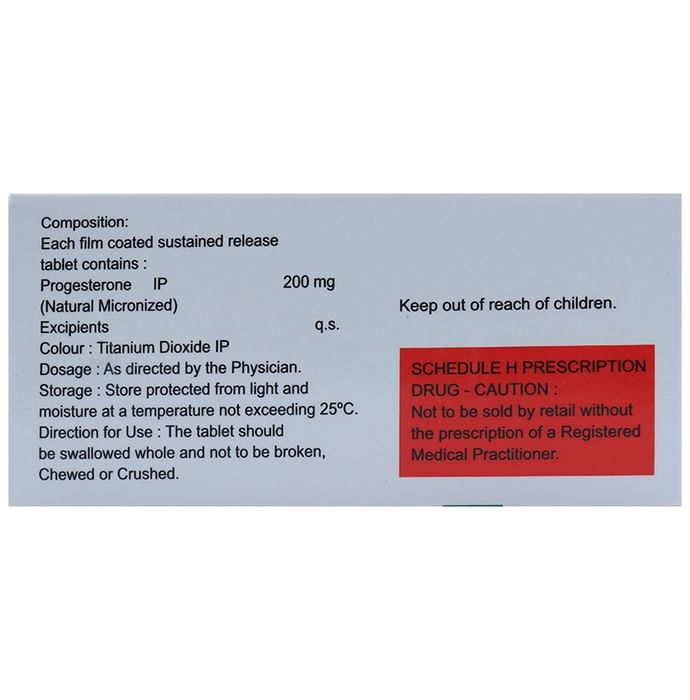Marketer:Bryson Pharmaceutical Llp,Composition:Progesterone (Natural Micronized) (200mg), medicine_typedrugs,Packaging Detail:strip of 10 tablet sr,          Package:Strip,Qty:10,Product Form:Tablet SR, prescription_required:Prescription Required,primary_use: