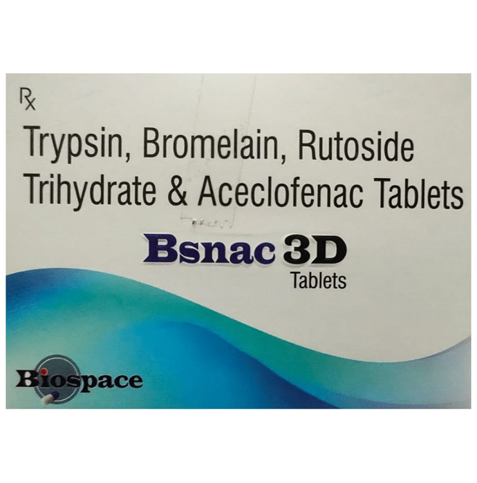 description:Bsnac 3D Tablet is a pain relieving medicine. It is used to reduce pain and inflammation in conditions like rheumatoid arthritis, ankylosing spondylitis, and osteoarthritis. It may also be used to relieve fever, muscle pain, back pain, toothache, or pain in the ear and throat. Bsnac 3D Tablet should be taken with food. This will prevent you from getting an upset stomach. You should take it regularly as advised by your doctor. Do not take more or use it for longer duration than recommended by your doctor.Some of the common side effects of this medicine include nausea, vomiting, heartburn, stomach pain, indigestion, loss of appetite, and diarrhea. If any of these side effects bother you or do not go away with time, you should let your doctor know. Your doctor may help you with ways to reduce or prevent the side effects.The medicine may not be suitable for everybody. Before taking it, let your doctor know if you have any problems with your heart, kidneys, liver, or have stomach ulcers. To make sure it is safe for you, let your doctor know about all the other medicines you are taking. Pregnant and breastfeeding mothers should first consult their doctors before using this medicine.
