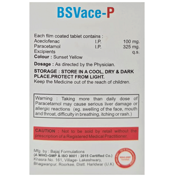 Marketer:BSVLMP Lifescience Pvt Ltd,Composition:Aceclofenac (100mg) + Paracetamol (325mg), medicine_typedrugs,Packaging Detail:strip of 10 tablets,          Package:Strip,Qty:10,Product Form:Tablet, prescription_required:Prescription Required,primary_use: