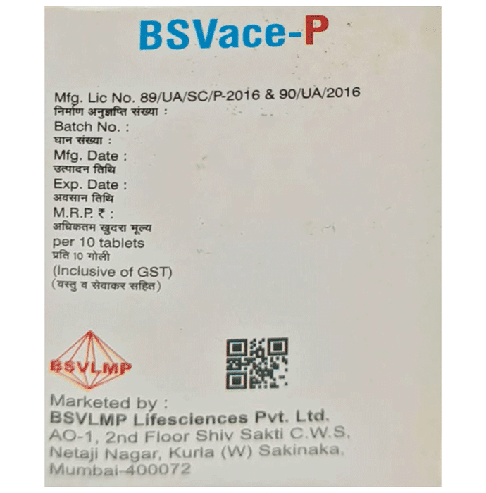description:Bsvace-P Tablet is a pain-relieving medicine. It is used to reduce pain and inflammation in conditions like rheumatoid arthritis, ankylosing spondylitis, and osteoarthritis. It may also be used to relieve muscle pain, back pain, toothache, or pain in the ear and throat. Bsvace-P Tablet should be taken with or without food. You should take it regularly as advised by your doctor. Your doctor may change the dose and time between doses according to your pain level and your needs. Do not take more or use it for a longer duration than recommended by your doctor.Some of the common side effects of this medicine include nausea, vomiting, stomach pain, heartburn, and diarrhea. If any of these side effects bother you or do not go away with time, you should let your doctor know. Your doctor may help you with ways to reduce or prevent these side effects by prescribing an alternative medicine or adjusting the dose.Bsvace-P Tablet may not be suitable for everybody. Before taking it, let your doctor know if you have any problems with your heart, kidneys, liver, or have stomach ulcers. To make sure it is safe for you, let your doctor know about all the other medicines you are taking. Pregnant and breastfeeding mothers should first consult their doctors before using Bsvace-P Tablet.