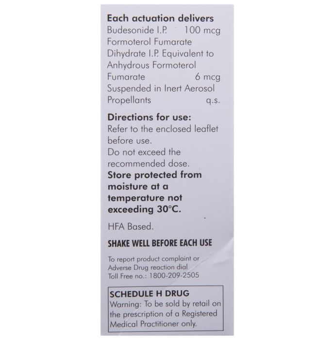 Marketer:Lupin Ltd,Composition:Formoterol (6mcg) + Budesonide (100mcg), medicine_typedrugs,Packaging Detail:packet of 120 MDI Inhaler,          Package:Packet,Qty:120 MDI,Product Form:Inhaler, prescription_required:Prescription Required,primary_use: