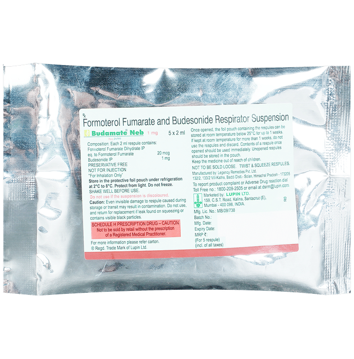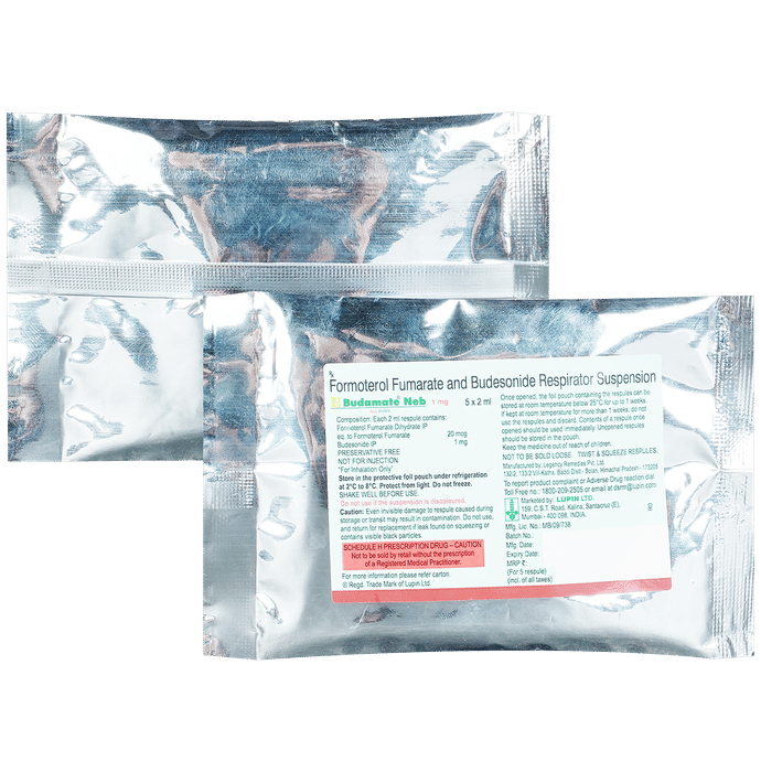 description:Budamate Neb 1mg Respules (2ml Each) is a combination of two medicines in one inhaler. It relieves the long-term symptoms of asthma and COPD, making breathing easier. It works by inhibiting the release of certain chemical messengers that cause inflammation (swelling) and relaxes the muscles in the airways.Your doctor will tell you how often you need to use your inhaler. The effect of this medicine may be noticeable after a few days but will only reach its maximum after a few weeks. This medicine must be used regularly to be effective, so go on taking it even if you don’t have any symptoms. That means it’s doing its job. If you stop taking it your symptoms may get worse. This medicine should not be used to relieve sudden shortness of breath. If sudden shortness of breath occurs, use your rescue inhaler. To get the benefit from this medicine you need to make sure you get your inhaler technique right, otherwise, it does not work as well.The most common side effects include headache, nausea, vomiting, stomach discomfort, and respiratory tract infection. If you get there, don’t stop taking it but do talk to your doctor. You can prevent some of these symptoms by rinsing your mouth and throat with water or brushing your teeth after using your inhaler. There are other, rarer side effects which can be serious. Talk to your doctor if you’re worried about them.Before taking it, you should tell your doctor if you have any kidney or liver diseases so that your doctor can prescribe a suitable dose for you. You should also tell your doctor if you are pregnant, planning pregnancy or breastfeeding.