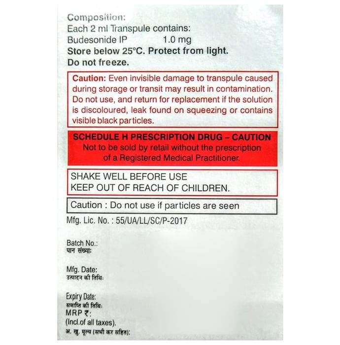Marketer:Lupin Ltd,Composition:Budesonide (1mg), medicine_typedrugs,Packaging Detail:packet of 5 transpules, Package:Packet,Qty:5,Product Form:Transpule, prescription_required:Prescription Required,primary_use: