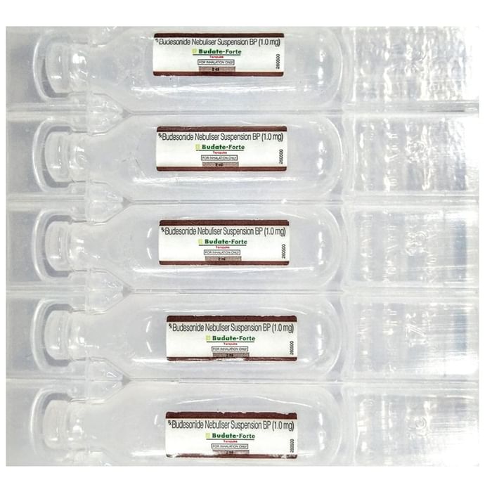 description:Budate Forte Transpules 2ml is used to prevent the symptoms of asthma (wheezing and shortness of breath). It is a steroid and is known as a ‘__’preventer’__’. You need to have a fast-acting “reliever” as well because this medicine will not stop an asthma attack that has already started. Your doctor will tell you how often you need to use Budate Forte Transpules 2ml. It is important that you take the lowest dose needed to effectively control your asthma. The effect of this medicine may be noticeable after a few days but will only reach its maximum after a few weeks. This medicine must be used regularly to be effective, so go on taking it even if you do not have any symptoms. No symptoms mean that the medicine is doing its job. If you stop taking it your asthma may get worse. It should not be used to relieve sudden asthma attacks. If an asthma attack occurs, use your quick-relief inhaler ‘__’reliever’__’. To get the benefit from this medicine you need to make sure you get your inhaler technique right, otherwise, it will not work as well.The most common side effects are irritation in the throat, difficulty swallowing, headache, and indigestion. If you get these, do not stop taking it but do talk to your doctor. You can help prevent these symptoms by rinsing your mouth and throat with water or brushing your teeth after using your inhaler. There are other rare, side effects that can be serious. Talk to your doctor if you are worried about them. In general, you should be trying to avoid situations that make your asthma worse (your triggers) and try not to smoke.Before taking Budate Forte Transpules 2ml, you should tell your doctor if you have tuberculosis, any infections in your mouth or lungs, or liver disease. While taking it you may be more at risk of getting infections so stay away from people with colds and flu. If you use Budate Forte Transpules 2ml for a long time it may cause weak bones (osteoporosis) and damage to your eyes (glaucoma or cataracts). You might need tests for bone density and eye pressure. Ask your doctor whether it’s safe to take this medicine if you are pregnant or breastfeeding.