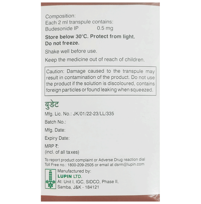 Marketer:Lupin Ltd,Composition:Budesonide (0.5mg), medicine_typedrugs,Packaging Detail:packet of 2 ml Transpules, Package:Packet,Qty:2 ml,Product Form:Transpule, prescription_required:Prescription Required,primary_use: