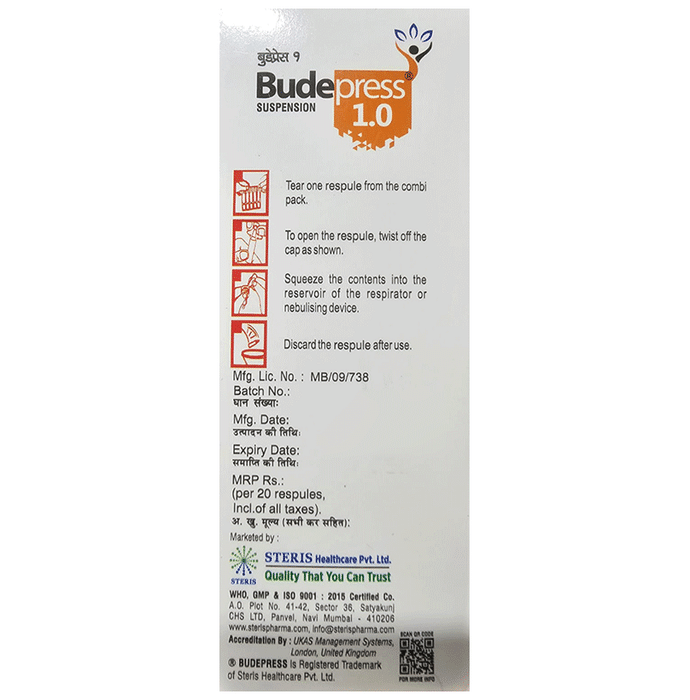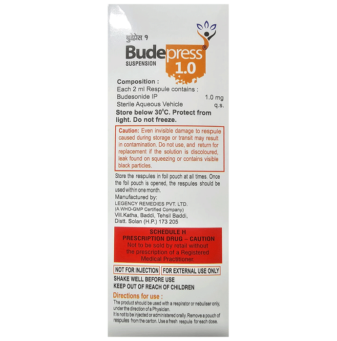 description:Budepress 1.0mg Respules (2ml Each) belongs to a group of medicines called steroids. It is used to treat moderate to severe ulcerative colitis. It helps relieve pain and inflammation caused by the condition. Budepress 1.0mg Respules (2ml Each) can be taken with or without food. To get maximum benefit of the medicine, take it regularly and at the fixed time of each day. Do not discontinue taking the medication without talking to your doctor as it may worsen your symptoms.Budepress 1.0mg Respules (2ml Each) may cause few common side effects such as mood changes or stomach upset. Taking Budepress 1.0mg Respules (2ml Each) can also make it harder for you to fight off infections. Tell your doctor if you have any signs of infection such as fever or sore throat.
