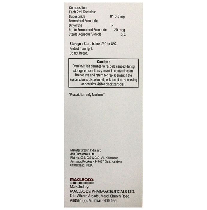 Marketer:Macleods Pharmaceuticals Pvt Ltd,Composition:Formoterol (20mcg) + Budesonide (0.5mg), medicine_typedrugs,Packaging Detail:packet of 5 respules,          Package:Packet,Qty:5,Product Form:Respule, prescription_required:Prescription Required,primary_use: