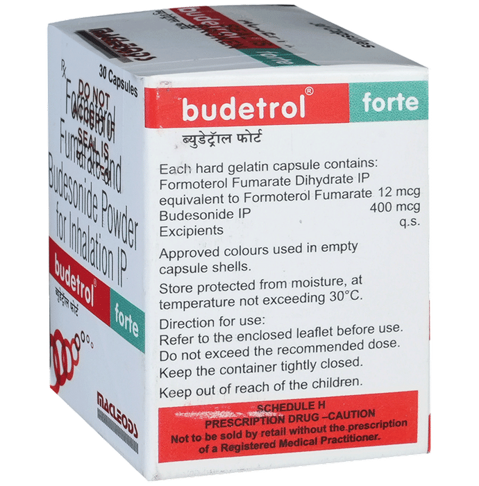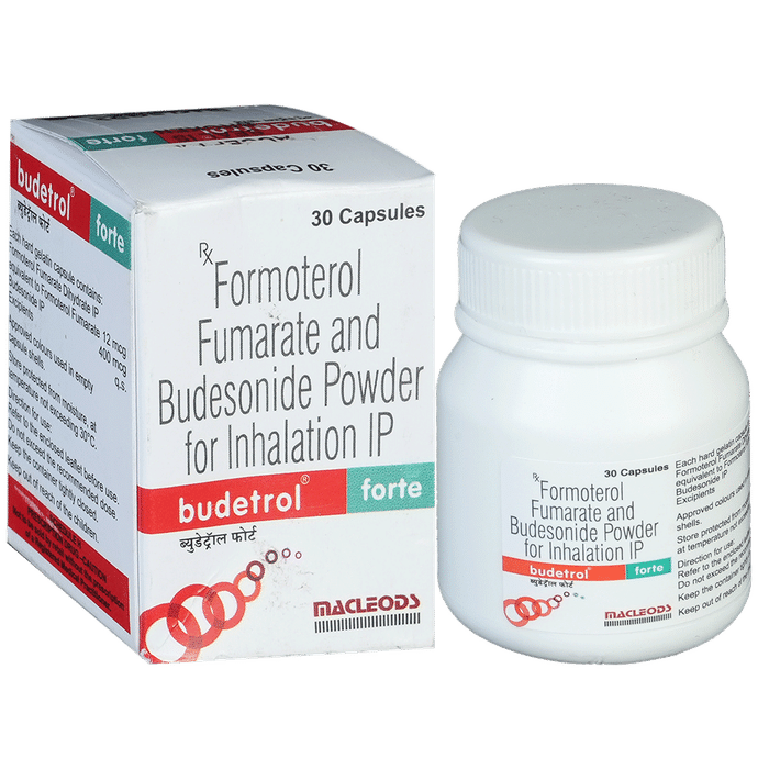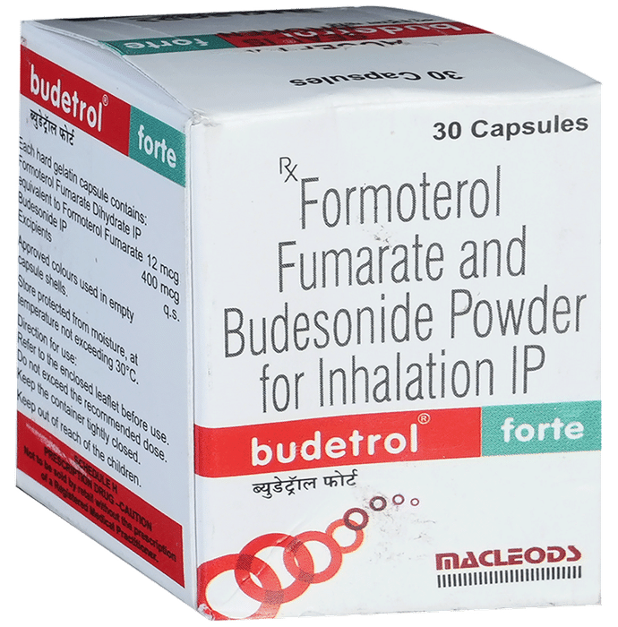 description:Budetrol Forte Capsule is a combination of two medicines in one inhaler. It relieves the long-term symptoms of asthma and COPD, making breathing easier. It works by inhibiting the release of certain chemical messengers that cause inflammation (swelling) and relaxes the muscles in the airways. Your doctor will tell you how often you need to use your inhaler. The effect of this medicine may be noticeable after a few days but will only reach its maximum after a few weeks. This medicine must be used regularly to be effective, so go on taking it even if you don’t have any symptoms. That means it’s doing its job. If you stop taking it your symptoms may get worse. This medicine should not be used to relieve sudden shortness of breath. If sudden shortness of breath occurs, use your rescue inhaler. To get the benefit from this medicine you need to make sure you get your inhaler technique right, otherwise, it does not work as well.The most common side effects include headache, nausea, vomiting, stomach discomfort, and respiratory tract infection. If you get there, don’t stop taking it but do talk to your doctor. You can prevent some of these symptoms by rinsing your mouth and throat with water or brushing your teeth after using your inhaler. There are other, rarer side effects which can be serious. Talk to your doctor if you’re worried about them.Before taking it, you should tell your doctor if you have any kidney or liver diseases so that your doctor can prescribe a suitable dose for you. You should also tell your doctor if you are pregnant, planning pregnancy or breastfeeding.