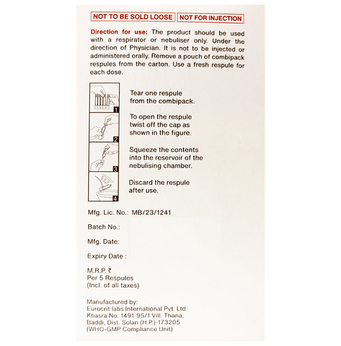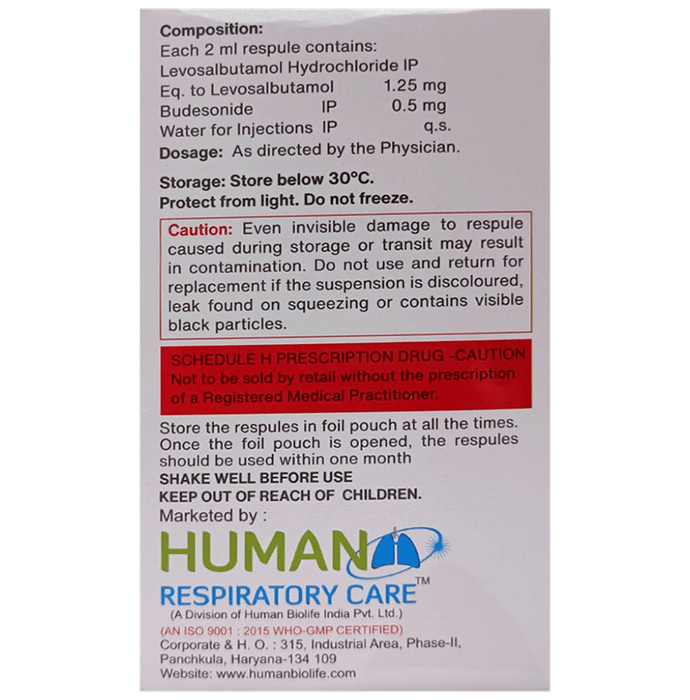 Marketer:Human Biolife India Pvt Ltd,Composition:Levosalbutamol (1.25mg) + Budesonide (0.5mg), medicine_typedrugs,Packaging Detail:box of 2.5 ml Respules,                   Package:Box,Qty:2.5 ml,Product Form:Respule, prescription_required:Prescription Required,primary_use: