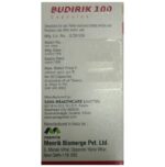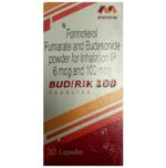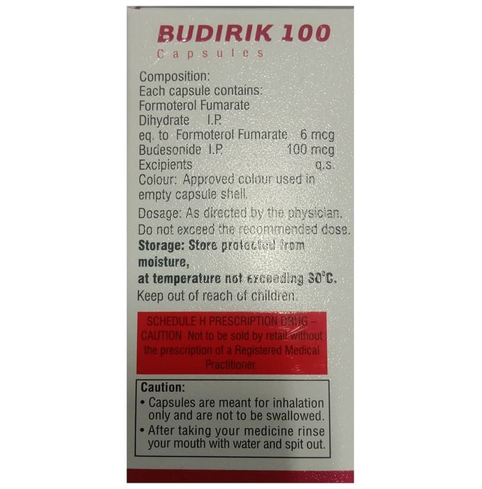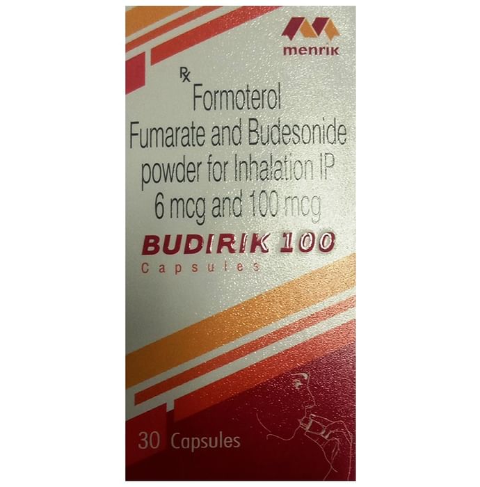 description:Budirik 100 Capsule is a combination of two medicines in one inhaler. It relieves the long-term symptoms of asthma and COPD, making breathing easier. It works by inhibiting the release of certain chemical messengers that cause inflammation (swelling) and relaxes the muscles in the airways. Your doctor will tell you how often you need to use your inhaler. The effect of this medicine may be noticeable after a few days but will only reach its maximum after a few weeks. This medicine must be used regularly to be effective, so go on taking it even if you don’t have any symptoms. That means it’s doing its job. If you stop taking it your symptoms may get worse. This medicine should not be used to relieve sudden shortness of breath. If sudden shortness of breath occurs, use your rescue inhaler. To get the benefit from this medicine you need to make sure you get your inhaler technique right, otherwise, it does not work as well.The most common side effects include headache, nausea, vomiting, stomach discomfort, and respiratory tract infection. If you get there, don’t stop taking it but do talk to your doctor. You can prevent some of these symptoms by rinsing your mouth and throat with water or brushing your teeth after using your inhaler. There are other, rarer side effects which can be serious. Talk to your doctor if you’re worried about them.Before taking it, you should tell your doctor if you have any kidney or liver diseases so that your doctor can prescribe a suitable dose for you. You should also tell your doctor if you are pregnant, planning pregnancy or breastfeeding.