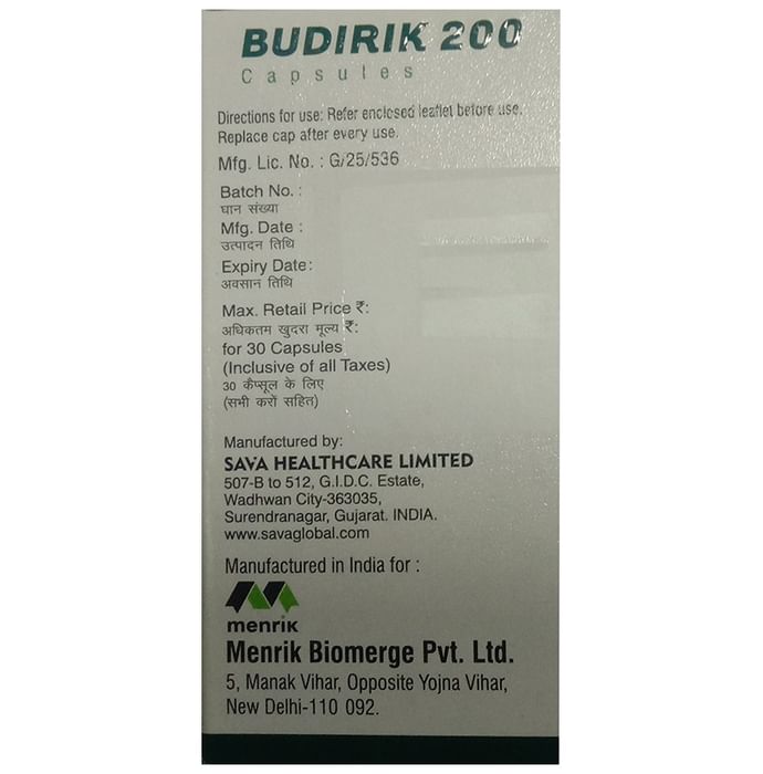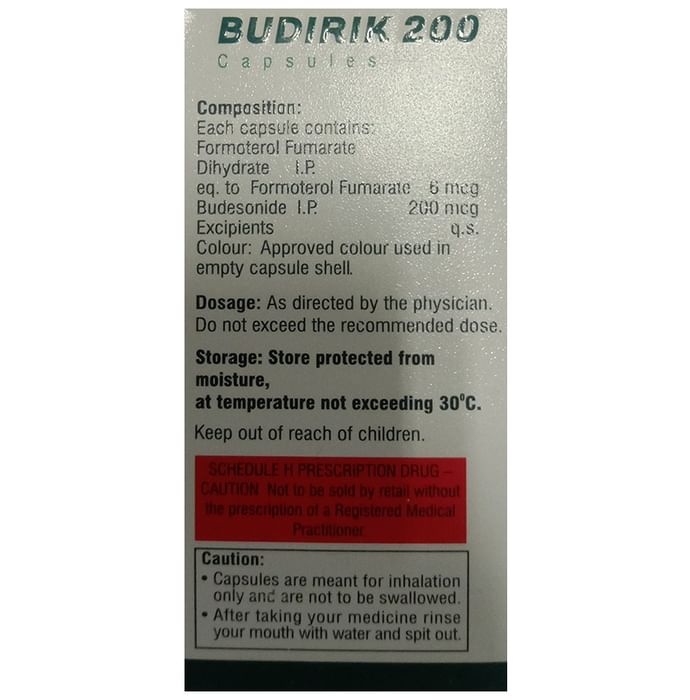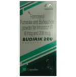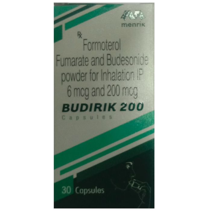 description:Budirik 200 Capsule is a combination of two medicines in one inhaler. It relieves the long-term symptoms of asthma and COPD, making breathing easier. It works by inhibiting the release of certain chemical messengers that cause inflammation (swelling) and relaxes the muscles in the airways. Your doctor will tell you how often you need to use your inhaler. The effect of this medicine may be noticeable after a few days but will only reach its maximum after a few weeks. This medicine must be used regularly to be effective, so go on taking it even if you don’t have any symptoms. That means it’s doing its job. If you stop taking it your symptoms may get worse. This medicine should not be used to relieve sudden shortness of breath. If sudden shortness of breath occurs, use your rescue inhaler. To get the benefit from this medicine you need to make sure you get your inhaler technique right, otherwise, it does not work as well.The most common side effects include headache, nausea, vomiting, stomach discomfort, and respiratory tract infection. If you get there, don’t stop taking it but do talk to your doctor. You can prevent some of these symptoms by rinsing your mouth and throat with water or brushing your teeth after using your inhaler. There are other, rarer side effects which can be serious. Talk to your doctor if you’re worried about them.Before taking it, you should tell your doctor if you have any kidney or liver diseases so that your doctor can prescribe a suitable dose for you. You should also tell your doctor if you are pregnant, planning pregnancy or breastfeeding.
