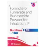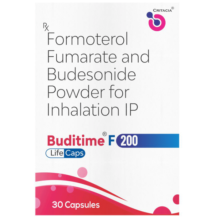 description:Buditime F 200 Capsule is a combination of two medicines in one inhaler. It relieves the long-term symptoms of asthma and COPD, making breathing easier. It works by inhibiting the release of certain chemical messengers that cause inflammation (swelling) and relaxes the muscles in the airways. Your doctor will tell you how often you need to use your inhaler. The effect of this medicine may be noticeable after a few days but will only reach its maximum after a few weeks. This medicine must be used regularly to be effective, so go on taking it even if you don’t have any symptoms. That means it’s doing its job. If you stop taking it your symptoms may get worse. This medicine should not be used to relieve sudden shortness of breath. If sudden shortness of breath occurs, use your rescue inhaler. To get the benefit from this medicine you need to make sure you get your inhaler technique right, otherwise, it does not work as well.The most common side effects include headache, nausea, vomiting, stomach discomfort, and respiratory tract infection. If you get there, don’t stop taking it but do talk to your doctor. You can prevent some of these symptoms by rinsing your mouth and throat with water or brushing your teeth after using your inhaler. There are other, rarer side effects which can be serious. Talk to your doctor if you’re worried about them.Before taking it, you should tell your doctor if you have any kidney or liver diseases so that your doctor can prescribe a suitable dose for you. You should also tell your doctor if you are pregnant, planning pregnancy or breastfeeding.