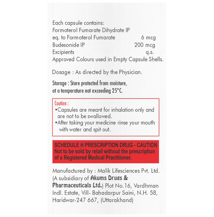 Marketer:Fibovil Pharmaceuticals Pvt Ltd,Composition:Formoterol (6mcg) + Budesonide (200mcg), medicine_typedrugs,Packaging Detail:bottle of 30 Powder for Inhalation,                   Package:Bottle,Qty:30,Product Form:Powder for Inhalation, prescription_required:Prescription Required,primary_use: