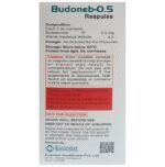 description:Budoneb 0.5 Respule is used to prevent the symptoms of asthma (wheezing and shortness of breath). It is a steroid and is known as a ‘__’preventer’__’. You need to have a fast-acting “reliever” as well because this medicine will not stop an asthma attack that has already started. Your doctor will tell you how often you need to use Budoneb 0.5 Respule. It is important that you take the lowest dose needed to effectively control your asthma. The effect of this medicine may be noticeable after a few days but will only reach its maximum after a few weeks. This medicine must be used regularly to be effective, so go on taking it even if you do not have any symptoms. No symptoms mean that the medicine is doing its job. If you stop taking it your asthma may get worse. It should not be used to relieve sudden asthma attacks. If an asthma attack occurs, use your quick-relief inhaler ‘__’reliever’__’. To get the benefit from this medicine you need to make sure you get your inhaler technique right, otherwise, it will not work as well.The most common side effects are irritation in the throat, difficulty swallowing, headache, and indigestion. If you get these, do not stop taking it but do talk to your doctor. You can help prevent these symptoms by rinsing your mouth and throat with water or brushing your teeth after using your inhaler. There are other rare, side effects that can be serious. Talk to your doctor if you are worried about them. In general, you should be trying to avoid situations that make your asthma worse (your triggers) and try not to smoke.Before taking Budoneb 0.5 Respule, you should tell your doctor if you have tuberculosis, any infections in your mouth or lungs, or liver disease. While taking it you may be more at risk of getting infections so stay away from people with colds and flu. If you use Budoneb 0.5 Respule for a long time it may cause weak bones (osteoporosis) and damage to your eyes (glaucoma or cataracts). You might need tests for bone density and eye pressure. Ask your doctor whether it’s safe to take this medicine if you are pregnant or breastfeeding.