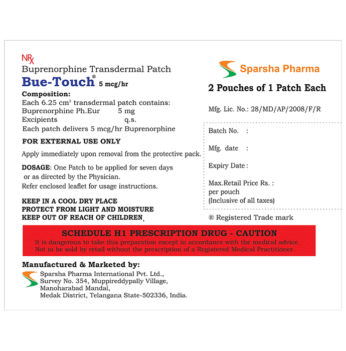 description:Bue Touch 5mg Patch is used to treat moderate to severe pain and drug dependence/addiction to opioids. It helps prevent withdrawal symptoms that may be caused due to withdrawal of other opioids. Your doctor will explain how to use Bue Touch 5mg Patch. Follow the instructions carefully to get the most benefit. The dose and duration will depend on what you are using it for and how well it helps your symptoms. Use it regularly and do not discontinue using it until the doctor tells you it is alright to stop.The most common side effects of this medicine include constipation, dizziness, drowsiness, headache, and nausea. You may have side effects more often when you start your treatment or when your dose is increased. Usually, the side effects will slowly go away as your body gets used to it. If they are severe or do not go away, you should remove your patch and contact your doctor.Before using the medicine, you should tell your doctor if you have any other illnesses or disorders. It may also affect, or be affected by some other drugs you are using. Let your doctor know all the other medicines you are taking or using to make sure it is safe for you. Pregnant and breastfeeding women should consult their doctors first before using the medicine.
