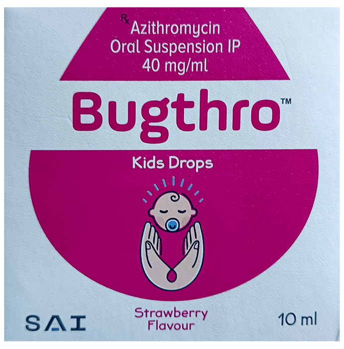 description:Bugthro Kids Drop Strawberry is an antibiotic used to treat various types of bacterial infections of the respiratory tract, ear, nose, throat, lungs, skin, and eye in adults and children. It is also effective in typhoid fever and some sexually transmitted diseases like gonorrhea. Bugthro Kids Drop Strawberry is taken orally, preferably one hour before or 2 hours after a meal. It should be used regularly at evenly spaced time intervals as prescribed by your doctor. Do not skip any doses and finish the full course of treatment even if you feel better. Stopping the medicine too early may lead to the return or worsening of the infection.Commonly seen side effects seen with this medicine include vomiting, nausea, stomach pain, headache, and diarrhea. These are usually temporary and subside with the completion of treatment. Consult your doctor if you find these side effects worry you or persist for a longer duration.Do not use Bugthro Kids Drop Strawberry if you have a history of cholestatic jaundice or hepatic dysfunction that happened with the use of azithromycin. Inform your doctor if you have any previous history of allergy or heart problems before taking this medicine. Pregnant or breastfeeding women should consult their doctor before using this medicine.