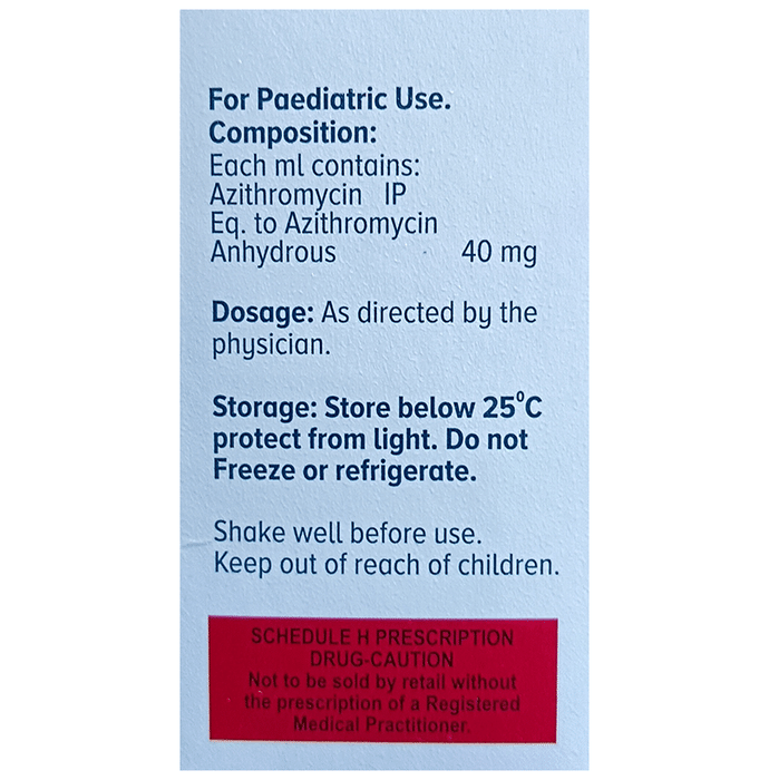 Marketer:Sai Parenterals Limited,Composition:Azithromycin (40mg/ml), medicine_typedrugs,Packaging Detail:bottle of 10 ml Oral Suspension,                   Package:Bottle,Qty:10 ml,Product Form:Oral Suspension, prescription_required:Prescription Required,primary_use: