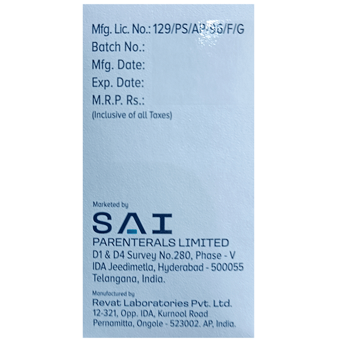 Manufacturer details:,                                                                     Marketer details:Sai Parenterals Limited | Sai Parenterals Limited Plot No. 39, 4th Floor, Lavanya Arcade, Jayabheri Enclave Gachibowli, Hyderabad – 500032