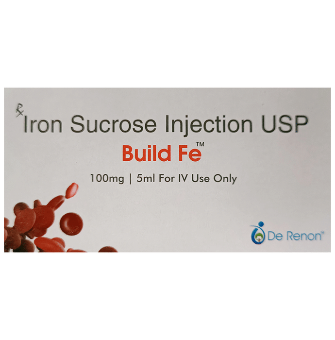 description:Build FE 100mg Injection is an iron replacement medicine. It is used to treat a type of anemia where you have too few red blood cells because you have too little iron in your body (iron-deficiency anemia). Iron is needed to produce the red blood cells that carry oxygen around your body. Build FE 100mg Injection is given by slow infusion (drip) into a vein by your doctor or nurse. Your doctor will decide the dose you need and how many injections you should have to improve your anemia. It will also help to eat a well-balanced diet that has enough iron. Good sources of iron include pulses (dal), green leafy vegetables like spinach, beans, eggs, dry fruits, and non-vegetarian foods.The most common side effects include altered taste, hypertension (high blood pressure), nausea, and injection site reactions (such as pain, redness, and swelling). Some people may develop a temporary fall in blood pressure (hypotension) if this medicine is given too rapidly. Your doctor will also monitor you for signs of an allergic reaction such as breathlessness, dizziness, feeling uneasy, hives, swelling of face, tongue, and throat, etc. while this medicine is being given. If you are bothered by them or they go on for longer, talk to your doctor or nurse.You should not have this medicine if your anemia is not caused by a lack of iron. Before taking it, tell your doctor if you have rheumatoid arthritis, asthma or other allergies, high blood pressure, or liver problems. This may affect your treatment. It is not known whether this medicine is safe for use if you are pregnant or breastfeeding so please take advice from your doctor. You will have tests to check your blood cells and iron levels, monitor your progress and check for side effects. It may be advisable to limit alcohol during treatment.