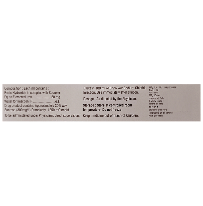 Marketer:De Renon Biotec Pvt. Ltd.,Composition:Iron Sucrose (20mg/ml), medicine_typedrugs,Packaging Detail:ampoule of 5 ml Injection,          Package:Ampoule,Qty:5 ml,Product Form:Injection, prescription_required:Prescription Required,primary_use: