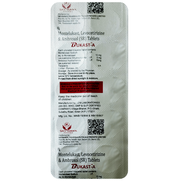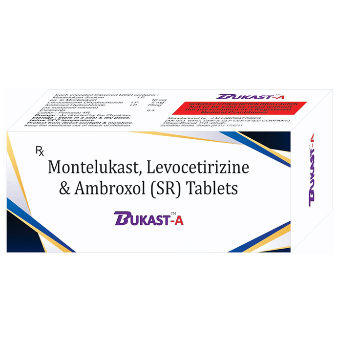 description:Bukast-A Tablet SR is a combination medicine used in the treatment of respiratory tract disorders associated with viscid mucus. It provides symptomatic relief of productive cough associated with respiratory tract disorders like bronchial asthma, bronchitis, and the common cold. Bukast-A Tablet SR may be taken with or without food in a dose and duration as advised by the doctor. The dose you are given will depend on your condition and how you respond to the medicine. You should keep taking this medicine for as long as your doctor recommends. If you stop treatment too early your symptoms may come back and your condition may worsen. Let your healthcare team know about all other medications you are taking as some may affect, or be affected by this medicine.The most common side effects are nausea, stomach upset, dryness in mouth, flu-like symptoms, fatigue, dizziness, and headache. Most of these are temporary and usually resolve with time. Contact your doctor straight away if you are at all concerned about any of these side effects. This medicine may also cause dizziness and sleepiness, so do not drive or do anything that requires mental focus until you know how this medicine affects you. Avoid drinking alcohol while taking this medicine as it can worsen your sleepiness.Before taking it, you should tell your doctor if you have any kidney or liver diseases so that your doctor can prescribe a suitable dose for you. You should also tell your doctor if you are pregnant, planning pregnancy or breastfeeding.