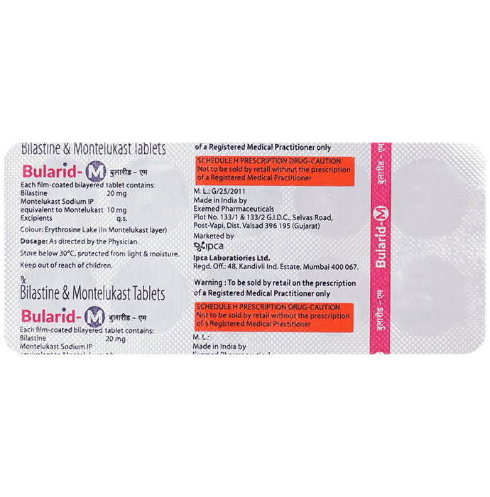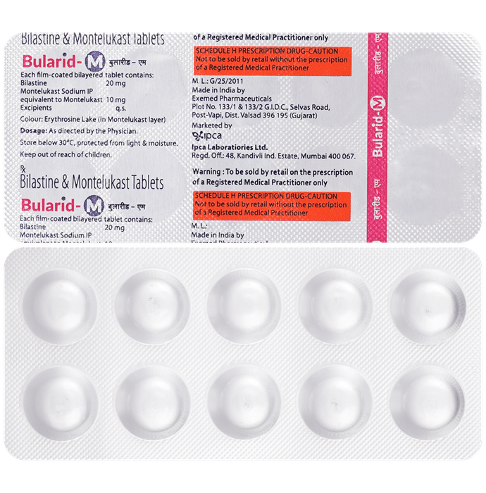 description:Bularid M 20mg/10mg Tablet is a combination of two medicines. It is used in the treatment of various allergic conditions. It reduces inflammation (redness, tenderness, heat, and swelling), itching, and rashes by blocking certain chemical messengers in the body. Bularid M 20mg/10mg Tablet may be taken with or without food. The dose may vary depending on what you are taking it for. Take it as it has been prescribed by your doctor. You may need this medicine only on days you have symptoms, or as prescribed by your doctor. If you stop taking it earlier than advised, your symptoms may come back.Common side effects include headache, pharyngitis, cough, abdominal pain, diarrhea, and otitis media. If you experience any of these that persist or bother you, let your doctor know. Before taking it, you should tell your doctor if you have any problems with your liver or kidneys or with your heart to make sure it is safe for you. Pregnant or breastfeeding women should also consult with their doctor before taking it.