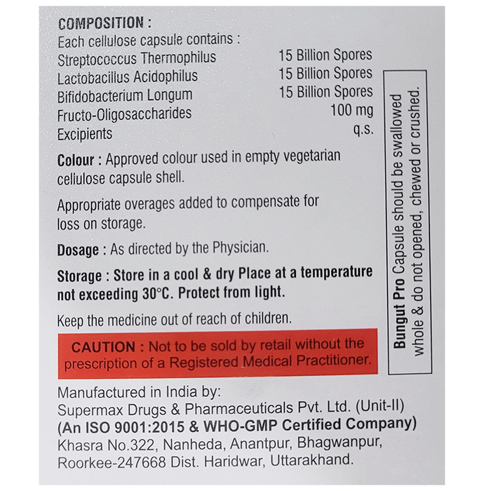 description:Bungut-Pro Capsule is a pre-probiotic combination that is used to treat chronic kidney disease. It metabolizes various nitrogenous wastes that diffuse from the bloodstream into the bowel and promotes healthy gut flora. This way it reduces the uremic toxins in renal-impaired patients. Take Bungut-Pro Capsule in the dose and duration as prescribed by your doctor as taking more than the recommended dose may cause undesirable side effects. Also, it is advised to take this medicine at a fixed time to avoid missing a dose.Generally, Bungut-Pro Capsule has little or no side effects. However, some people may experience gas or flatulence. These effects usually disappear after 2 to 3 weeks of continuous usage, but if they persist or get worse, consult with your doctor.To make sure that Bungut-Pro Capsule is safe for you, let your doctor know if you have any other health conditions. Inform them if you are taking any other medicines or are pregnant or breastfeeding.