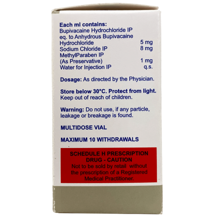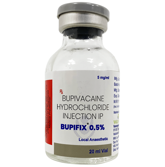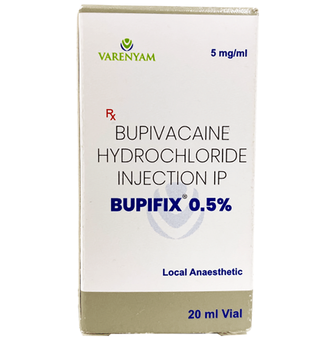 description:Bupifix 0.5% Injection is a prescription medication used as a local anesthetic. It is used during minor surgical procedures such as dental, oral, diagnostic, or other therapeutic procedures to anesthetize or numb the surgical area. This medicine can also be useful in the relief of pain, e.g. during labor. Bupifix 0.5% Injection blocks the nerve impulses that send pain signals to your brain and helps to perform a painless procedure by temporarily numbing the surgical area. Like many other medicines, this medicine also has few side effects. The most common side effects of this medicine are nausea, vomiting, tingling sensation, slow heart rate, high or low blood pressure, dizziness, and urinary retention. These are usually mild and short-lived. If the numbness or other side effects persist, consult your doctor without delay.Before using Bupifix 0.5% Injection, it is very important to tell your doctor if you have any underlying heart disease or are taking medicines for heart rhythm problems. Let your doctor know if you are pregnant or breastfeeding. Also, it is not safe to drive or operate heavy machinery while on medication, unless your doctor permits you to do so.