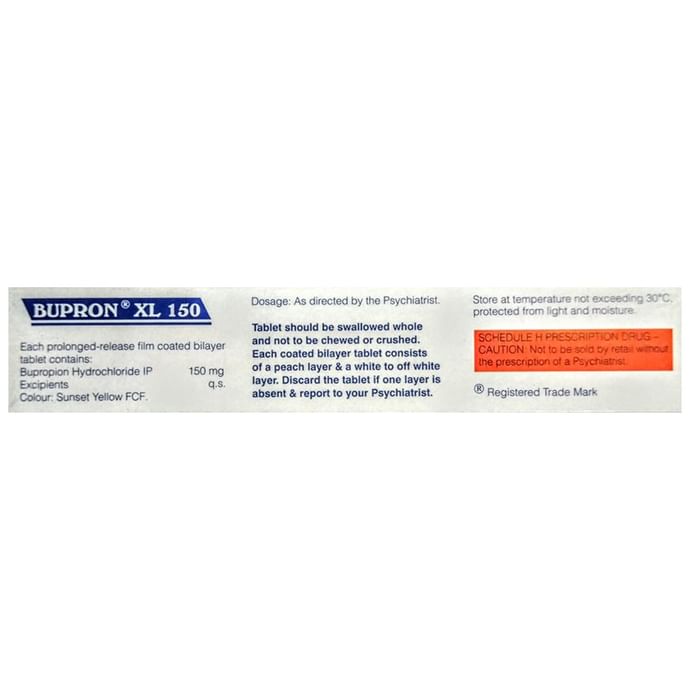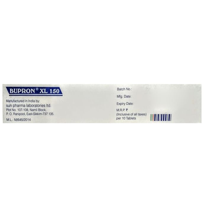 description:Bupron XL 150 Tablet is used in the treatment of depression and smoking addiction. This medicine helps by increasing the level of chemical messengers in the brain that relax the nerves and have a calming effect on the brain. Bupron XL 150 Tablet may be taken with or without food. It is advised to take this medicine at a fixed time each day. You should never skip any doses and finish the full course of treatment even if you feel better. This medication mustn’t be stopped suddenly as it may worsen your symptoms.Some common side effects of this medicine include insomnia (difficulty sleeping), allergic reaction, impaired concentration, sweating, headache, nausea, vomiting, and dry mouth. It even causes dizziness and sleepiness, so do not drive or do anything that requires mental focus. Moreover, most of the side effects are immediate and often go away with time. Please consult your doctor if these bother you or do not go away.Before taking this medicine it is important to inform your doctor if you have any history of seizure or if you drink alcohol. Inform your doctor if you develop any unusual mood changes or if you have any suicidal thoughts.