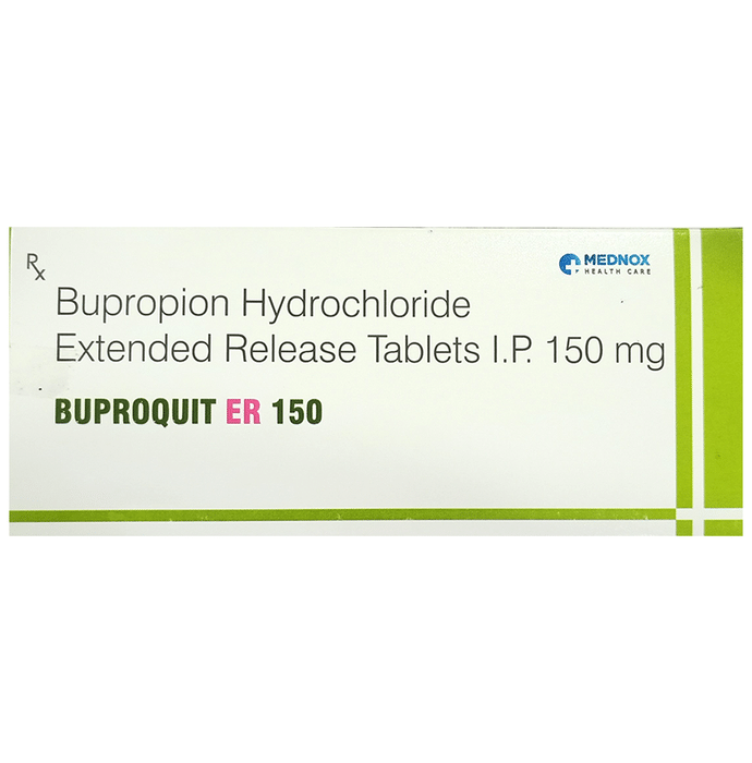 description:Buproquit ER 150 Tablet is used in the treatment of depression and smoking addiction. This medicine helps by increasing the level of chemical messengers in the brain that relax the nerves and have a calming effect on the brain. Buproquit ER 150 Tablet may be taken with or without food. It is advised to take this medicine at a fixed time each day. You should never skip any doses and finish the full course of treatment even if you feel better. This medication mustn’t be stopped suddenly as it may worsen your symptoms.Some common side effects of this medicine include insomnia (difficulty sleeping), allergic reaction, impaired concentration, sweating, headache, nausea, vomiting, and dry mouth. It even causes dizziness and sleepiness, so do not drive or do anything that requires mental focus. Moreover, most of the side effects are immediate and often go away with time. Please consult your doctor if these bother you or do not go away.Before taking this medicine it is important to inform your doctor if you have any history of seizure or if you drink alcohol. Inform your doctor if you develop any unusual mood changes or if you have any suicidal thoughts.