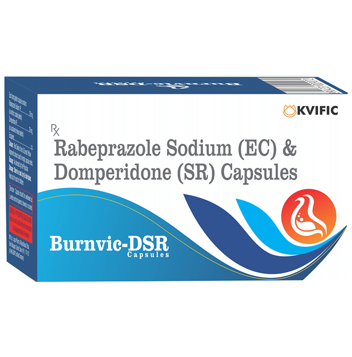 description:Burnvic-DSR Capsule is a combination medicine used to treat gastroesophageal reflux disease (Acid reflux). It works by relieving the symptoms of acidity such as heartburn, stomach pain, or irritation. It also neutralizes the acid and promotes easy passage of gas to reduce stomach discomfort. Burnvic-DSR Capsule is taken without food in a dose and duration as advised by the doctor. The dose you are given will depend on your condition and how you respond to the medicine. You should keep taking this medicine for as long as your doctor recommends. If you stop treatment too early your symptoms may come back and your condition may worsen. Let your healthcare team know about all other medications you are taking as some may affect, or be affected by this medicine.The most common side effects are diarrhea, stomach pain, dryness in the mouth, headache, flatulence, and weakness. Most of these are temporary and usually resolve with time. Contact your doctor straight away if you are at all concerned about any of these side effects. This medicine may cause dizziness and sleepiness, so do not drive or do anything that requires mental focus until you know how this medicine affects you. Avoid drinking alcohol while taking this medicine as it can worsen your sleepiness. Lifestyle modifications like having cold milk and avoiding hot tea, coffee, spicy food or chocolate can help you to get better results.Before you start taking this medicine it is important to inform your doctor if you are suffering from kidney or liver disease. You should also tell your doctor if you are pregnant, planning pregnancy or breastfeeding.