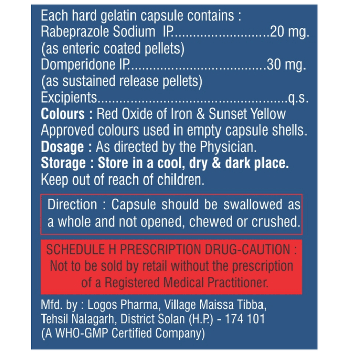 Marketer:Kvific Pharmaceutical Pvt Ltd,Composition:Domperidone (30mg) + Rabeprazole (20mg), medicine_typedrugs,Packaging Detail:strip of 10 capsule sr,          Package:Strip,Qty:10,Product Form:Capsule SR, prescription_required:Prescription Required,primary_use: