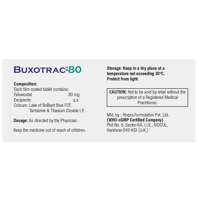 description:Buxotrac 80 Tablet is a medicine used to treat and prevent gout. Gout happens when there is too much uric acid in your body and it forms into crystals that can appear around your joints leading to painful and swollen joints. This medicine helps to keep uric acid levels low. Buxotrac 80 Tablet can be taken with or without food. You should keep taking it as recommended by your doctor even when you are not having a gout attack. If you stop, your symptoms may get worse because of the formation of more crystals in your joints. You can help yourself by making some changes to your diet (eg. avoiding alcohol and non-vegetarian foods) and drinking plenty of fluids.Some of the common side effects of this medicine are liver function abnormalities, nausea, joint pain, and rashes. You may experience a temporary increase in the gout symptoms (rapid onset of severe pain, warmth, and redness in the joint) when you first start taking the medicine. However, do not stop taking the medicine. Your doctor may suggest some painkillers and additional medicines to help reduce or prevent these symptoms. Tell your doctor right away if you get any symptoms of liver disease like persistent nausea, dark urine, or yellowing of the eyes or skin.Before taking this medicine, let your doctor know if you have any heart problems, stroke, thyroid problems, or kidney or liver problems. If you are pregnant or breastfeeding, this medicine is best avoided. Check with your doctor. You will need regular blood tests while taking this medicine to check that your liver is working properly.
