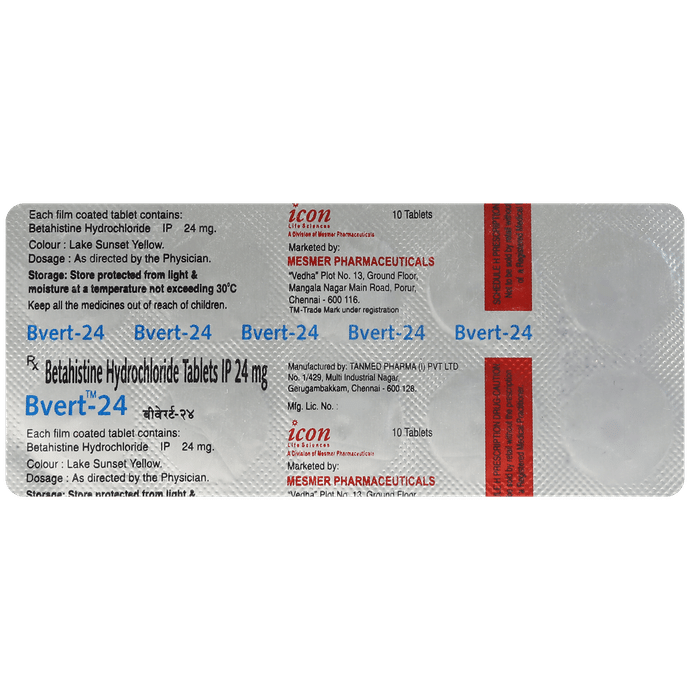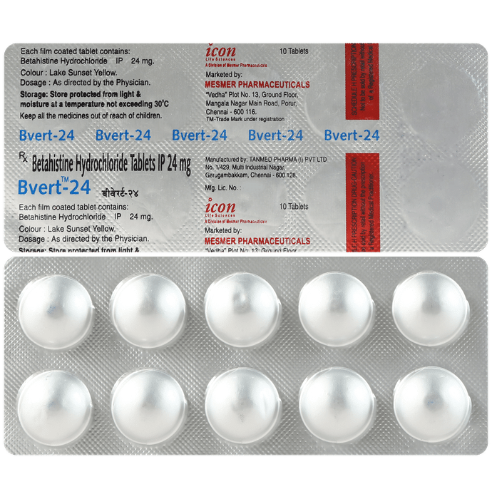 description:Bvert 24mg Tablet is used to prevent and treat a disorder of the inner ear known as Ménière’s disease. The symptoms include dizziness (vertigo), ringing in the ears (tinnitus), and loss of hearing, probably caused by fluid in the ear. This medicine helps relieve the symptoms by reducing the amount of fluid. Bvert 24mg Tablet should be swallowed whole with water and taken at the same time(s) each day to get the most benefit. Your doctor will decide what is the correct dose to relieve your symptoms and how often you need to take it. You may need to take this medicine for several months and you should take it for as long as prescribed by your doctor, even if you start feeling better. The most common side effects include headache, feeling sick, and indigestion (dyspepsia). You may also get stomach pain and bloating. Taking the medicine with food can help reduce stomach problems.  Before taking this medicine, you should talk to your doctor if you have a stomach ulcer, asthma, or high or low blood pressure. You must also tell him/her what other medicines you are taking, to make sure you are safe. Also speak to your doctor if you are pregnant, trying to become pregnant, or breastfeeding.