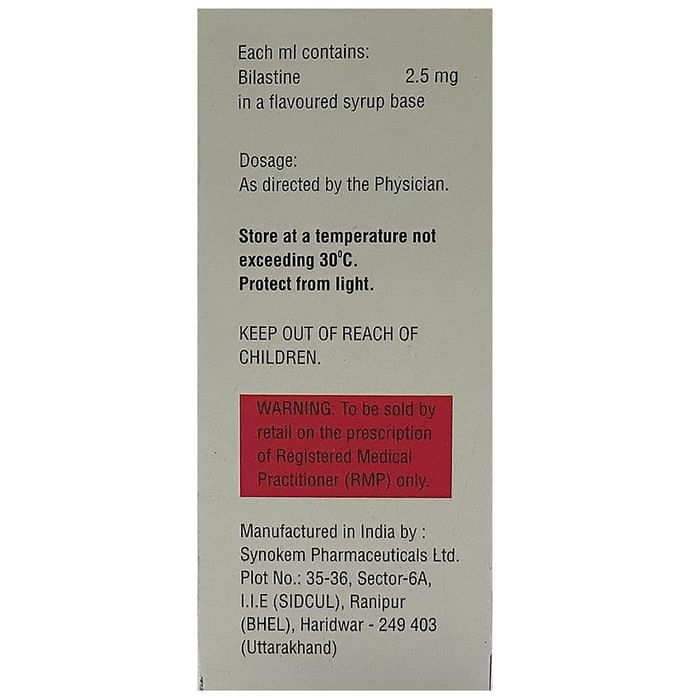 Marketer:Lupin Ltd,Composition:Bilastine (2.5mg/ml), medicine_typedrugs,Packaging Detail:bottle of 60 ml Oral Solution,          Package:Bottle,Qty:60 ml,Product Form:Oral Solution, prescription_required:Prescription Required,primary_use: