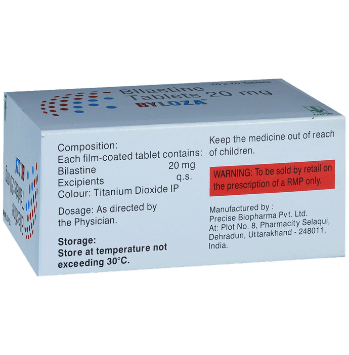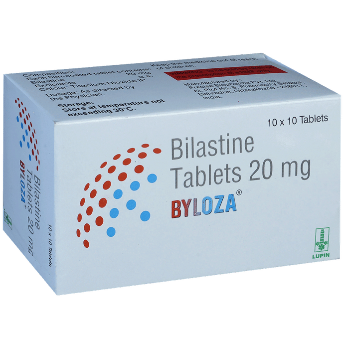 description:Byloza Tablet belongs to a group of medicines known as antihistamines. It is used in the treatment of allergy symptoms such as runny nose, stuffy nose, sneezing, watery eyes, and congestion or stuffiness. Byloza Tablet can be taken one hour before or two hours after food, but take it at the same time to get the most benefit. It should be taken as your doctor’s advice. The dose and how often you take it depends on what you are taking it for. Your doctor will decide how much you need to improve your symptoms. Remember dosage is decided on the basis of the type of medicine (tablet or syrup ), age, and present medical condition of the person. You should take this medicine for as long as it is prescribed for you. If you do not observe any improvement in the symptoms, consult with the doctor.The most common side effects of this medicine include headaches and drowsiness. If these bother you or appear serious, let your doctor know. There may be ways of reducing or preventing them. Generally, it is advised to drink plenty of fluids while on treatment with this medicine. To overcome dizziness, avoid driving or attention-seeking activities until you know how the medicine affects you.Before taking this medicine, let your doctor know if you are pregnant, or breastfeeding. Your doctor should also know about all other medicines you are taking as many of these may make this medicine less effective or change the way it works. You must avoid fruit juice before taking the medicine.