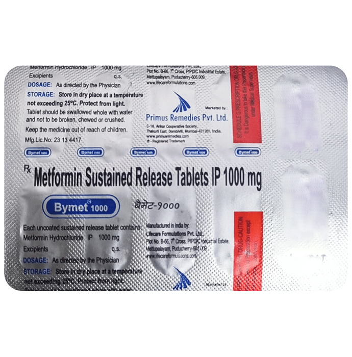 description:Bymet 1000 Tablet SR is a medicine used to treat type 2 diabetes mellitus. It helps control blood sugar levels and thus prevent serious complications of diabetes. It is also used to treat a menstruation-related disorder known as Polycystic ovary syndrome (PCOS) in women. Bymet 1000 Tablet SR is best taken with food to avoid nausea and abdominal pain. You should take it regularly, at the same time each day, to get the most benefit. You should not stop taking this medicine unless your doctor recommends it. Your lifestyle plays a big part in controlling diabetes. Therefore, it is important to stay on the diet and exercise program recommended by your doctor while taking this medicine. The most common side effects of this medicine include diarrhea, nausea, vomiting, flatulence, weakness, indigestion, abdominal discomfort, headache, and loss of appetite. Some people may develop hypoglycemia (low blood sugar level) when this medicine is taken along with other antidiabetic medicines, alcohol, or upon skipping a meal. Monitor your blood sugar levels regularly while taking it.Before taking this medicine, inform your doctor if you have any kidney, liver, or heart problems. Pregnant or breastfeeding women should also consult their doctor before taking it. Your doctor will check your kidney function tests before starting treatment with it. Avoid excessive alcohol intake while taking it as this may increase the risk of developing some side effects.