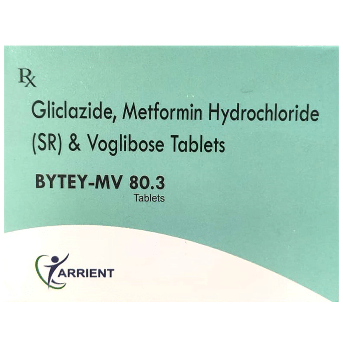 description:Bytey-MV 80.3 Tablet SR belongs to a category of medicines known as anti-diabetic drugs. It is a combination of medicines used to treat type 2 diabetes mellitus in adults. It helps control blood sugar levels in people with diabetes. Bytey-MV 80.3 Tablet SR should be taken with food. Take it regularly at the same time each day to get the most benefit. Your doctor will decide what dose is best for you and this may change from time to time according to how it is working according to your blood sugar levels.Keep taking this medicine, even if you feel well or your blood sugar levels are controlled. If you stop it without consulting your doctor, your blood sugar levels could rise and put you at risk of kidney damage, blindness, nerve problems and loss of limbs. Remember that it is only part of a treatment program that should also include a healthy diet, regular exercise, and weight reduction as advised by your doctor. Your lifestyle plays a big part in controlling diabetes.The most common side effect of Bytey-MV 80.3 Tablet SR is low blood glucose levels (hypoglycemia). Make sure you recognize the signs of having low blood glucose levels, such as sweating, dizziness, headache, and shaking and know how to deal with it. To prevent this, it’s important to have regular meals and always carry a fast-acting source of glucose such as sugary food or fruit juice with you. Drinking alcohol can also increase your risk of low blood sugar levels and should be avoided. Other side effects that may be seen on taking this medicine include taste changes, nausea, vomiting, diarrhea, stomach pain, headache, edema (swelling), blurred vision, and bone fracture. Some people may find that they put on weight with this medicine.You should not take it if you have type 1 diabetes mellitus, if you have diabetic ketoacidosis (high levels of acid in your blood), or if you have severe kidney or liver disease. Before taking this medicine, tell your doctor if you have ever had heart disease. It may not be suitable. Pregnant or breastfeeding women should also consult their doctor before taking it. Your blood sugar levels should be checked regularly and your doctor may also advise blood tests to monitor your blood cell counts and liver function.