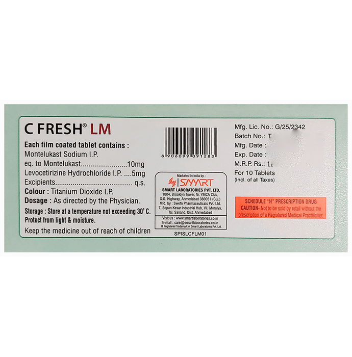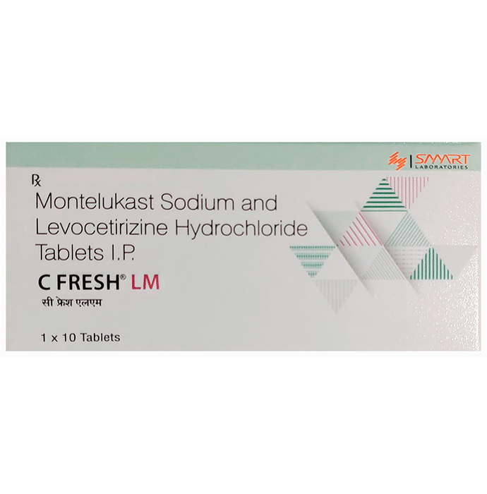 description:C Fresh LM 5mg/10mg Tablet is a combination medicine used in the treatment of allergic symptoms such as runny nose, stuffy nose, sneezing, itching, swelling, watery eyes and congestion or stuffiness. It also reduces inflammation in the airways and make breathing easier. C Fresh LM 5mg/10mg Tablet is taken with or without food in a dose and duration as advised by the doctor. The dose you are given will depend on your condition and how you respond to the medicine. You should keep taking this medicine for as long as your doctor recommends. If you stop treatment too early your symptoms may come back and your condition may worsen. Let your healthcare team know about all other medications you are taking as some may affect, or be affected by this medicine.The most common side effects are nausea, diarrhea, vomiting, dryness in the mouth, headache, skin rash, flu-like symptoms, and fatigue. Most of these are temporary and usually resolve with time. Contact your doctor straight away if you are at all concerned about any of these side effects. This medicine may cause dizziness and sleepiness, so do not drive or do anything that requires mental focus until you know how this medicine affects you. Avoid drinking alcohol while taking this medicine as it can worsen your sleepiness.Never support self-medication or recommend your medicine to another person. It is beneficial to have plenty of fluids while taking this medication. Before you start taking this medicine it is important to inform your doctor if you are suffering from kidney disease.