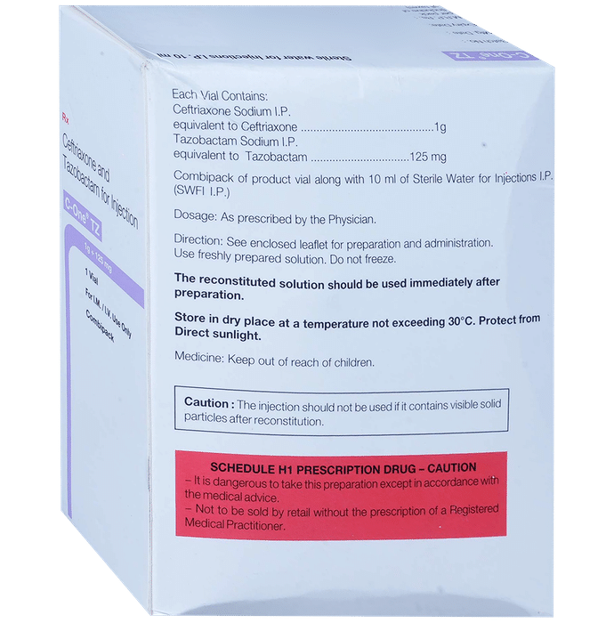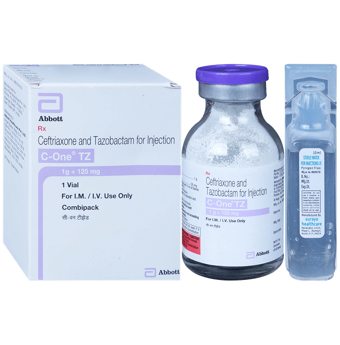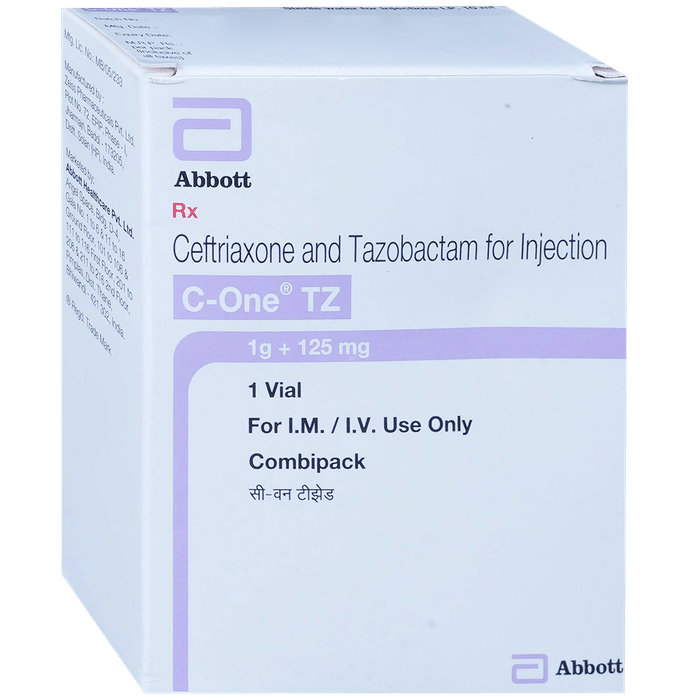 description:C One TZ 1000mg/125mg Injection is a combination medicine. It is prescribed to treat various types of bacterial infections. It fights against the microorganisms to prevent their growth and further spread of the infection. C One TZ 1000mg/125mg Injection should only be administered under the supervision of a healthcare professional. Do not miss any scheduled appointments for taking this medicine. The course of the treatment must be completed even if you feel better. Sudden discontinuation of the treatment may affect the potency of the medicine.Some common side effects of this medicine are nausea, vomiting, diarrhea, indigestion, etc. If any of the side effects get aggravated, you must consult your doctor immediately. If you experience any allergic reaction (rashes, itching, swelling, shortness of breath, etc.), you must seek immediate medical help.Before taking this medicine, you should tell your doctor if you are taking any medicines for any health condition. Pregnant or breastfeeding women should also consult with their doctor before taking it. Avoid drinking alcohol as it can cause excessive drowsiness with this medicine. It usually does not impair your ability to drive, but you should not drive if it makes you feel sleepy or dizzy. You must take adequate rest for a faster recovery, also take a healthy diet and drink plenty of water. Your doctor may ask for a few laboratory and diagnostic tests to know the effects of the medicine on your body.