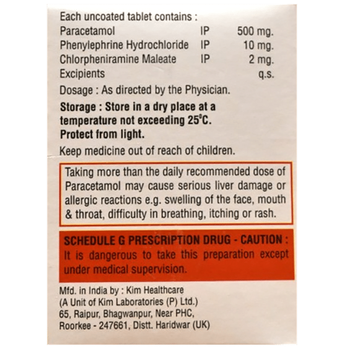 Marketer:Vin Medicament Pvt Ltd,Composition:Chlorpheniramine Maleate (2mg) + Paracetamol (500mg) + Phenylephrine (10mg), medicine_typedrugs,Packaging Detail:strip of 10 tablets,                   Package:Strip,Qty:10,Product Form:Tablet, prescription_required:Prescription Required,primary_use: