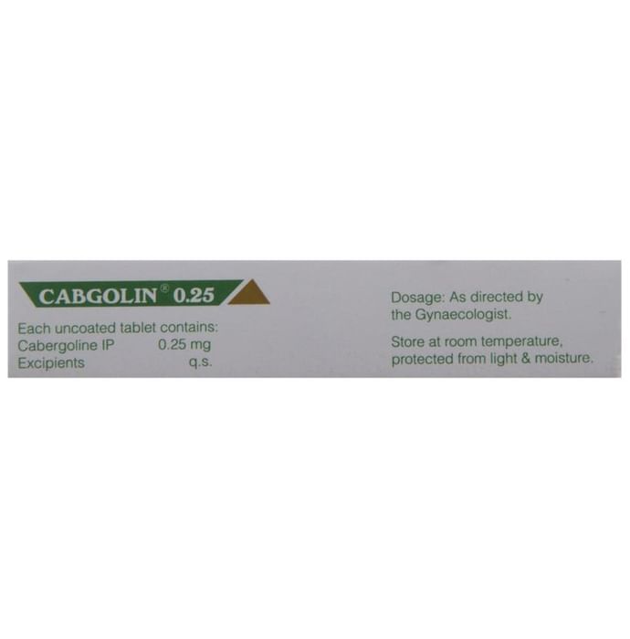 description:Cabgolin 0.25 Tablet is a dopamine agonist. It is used for the treatment of a high level of prolactin. It is also helpful in stopping breast milk production in cases of stillbirth, abortion, or miscarriage. Cabgolin 0.25 Tablet should be taken with food, but take it at the same time to get the most benefit. It should be taken as your doctor’s advice. The dose and how often you take it depends on what you are taking it for. Your doctor will decide how much you need to improve your symptoms. Swallow the tablets whole with a drink of water. You should take this medicine for as long as it is prescribed for you.The most common side effects of this medicine include nausea, headache, dizziness, and low blood pressure. If these bother you or appear serious, let your doctor know. There may be ways of reducing or preventing them. To overcome dizziness, you must avoid driving or rise slowly from sitting or lying position.Before taking this medicine, tell your doctor if you have ever had high blood pressure after birth, or had heart disease. Tell your doctor if you are pregnant, planning pregnancy, or breastfeeding. Your doctor should also know about all other medicines you are taking as many of these may make this medicine less effective or change the way it works. Your doctor may check blood pressure regularly while taking this medicine.