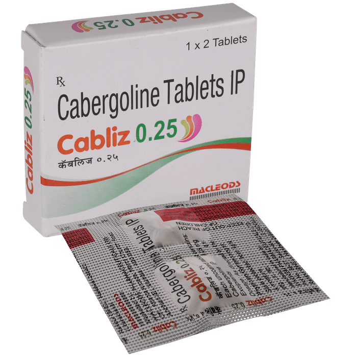description:Cabliz 0.25mg Tablet is a dopamine agonist. It is used for the treatment of a high level of prolactin. It is also helpful in stopping breast milk production in cases of stillbirth, abortion, or miscarriage. Cabliz 0.25mg Tablet should be taken with food,  but take it at the same time to get the most benefit. It should be taken as your doctor’s advice. The dose and how often you take it depends on what you are taking it for. Your doctor will decide how much you need to improve your symptoms. Swallow the tablets whole with a drink of water. You should take this medicine for as long as it is prescribed for you.The most common side effects of this medicine include nausea, headache, dizziness, and low blood pressure. If these bother you or appear serious, let your doctor know. There may be ways of reducing or preventing them.  To overcome dizziness, you must avoid driving or rise slowly from sitting or lying position.Before taking this medicine, tell your doctor if you have ever had high blood pressure after birth, or had heart disease. Tell your doctor if you are pregnant, planning pregnancy, or breastfeeding. Your doctor should also know about all other medicines you are taking as many of these may make this medicine less effective or change the way it works. Your doctor may check blood pressure regularly while taking this medicine.