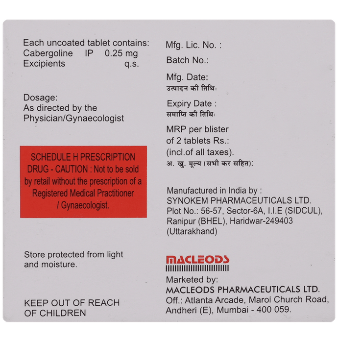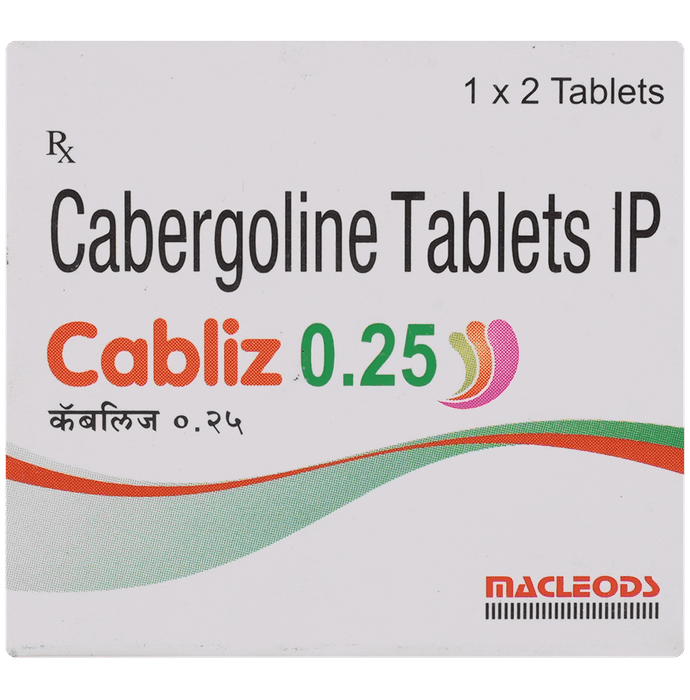 Marketer:Macleods Pharmaceuticals Pvt Ltd,Composition:Cabergoline (0.25mg), medicine_typedrugs,Packaging Detail:strip of 2 tablets,                   Package:Strip,Qty:2,Product Form:Tablet, prescription_required:Prescription Required,primary_use: