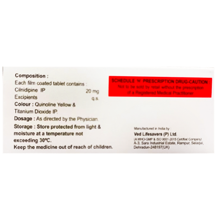 Marketer:Arrient Healthcare Pvt Ltd,Composition:Cilnidipine (20mg), medicine_typedrugs,Packaging Detail:strip of 10 tablets,                   Package:Strip,Qty:10,Product Form:Tablet, prescription_required:Prescription Required,primary_use: