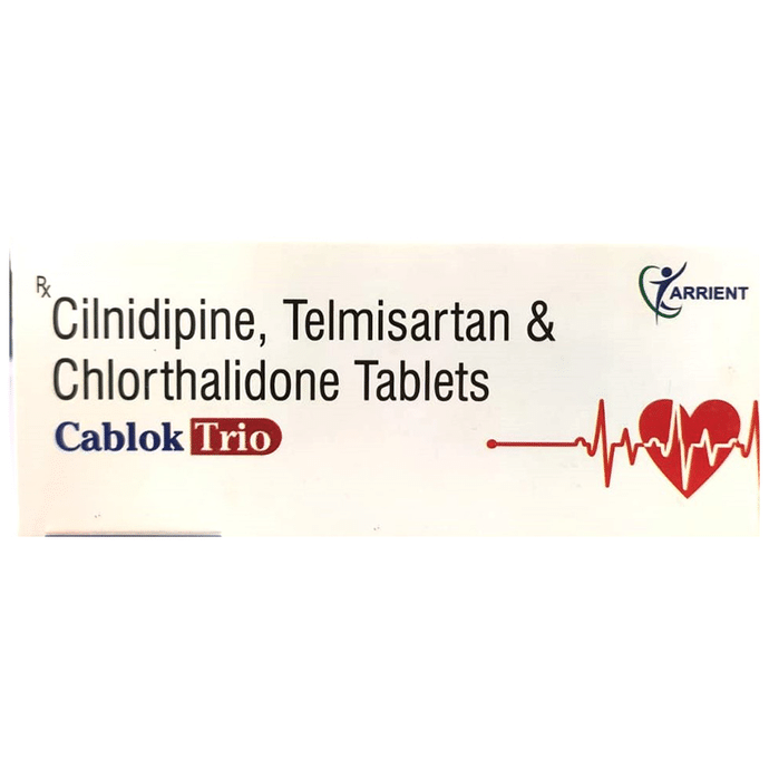 description:Cablok Trio Tablet is a combination of medicines used to treat hypertension (high blood pressure) when a single medication is not effective. It helps to lower high blood pressure thus reduces chances of future heart attack and stroke. Cablok Trio Tablet should be taken with food. The dose will depend on your condition and how you respond to the medicine. Try to take it at the same time each day. It is important to keep taking this medicine until your doctor tells you not to. It contains a diuretic (water pill) and will make you urinate more so, it is best to avoid taking this medicine within four hours of going to bed. Use this medicine regularly to get the most benefit from it even if you feel well. High blood pressure does not usually have symptoms and if you stop taking it your risk of heart attack or stroke may increase.The most common side effects of this medicine include ankle swelling, headache, dizziness, tiredness, and taste change. Consult your doctor If any of these bother you, or get worse, or won’t go away. Drink plenty of fluids while taking medicine to overcome muscle weakness, dry mouth, and extreme thirst.Before taking it, let your doctor know if you have any liver or kidney problems. Pregnant or breastfeeding women should also consult their doctor for advice before taking this medicine. You also need to tell your doctor what other medicines you are taking especially those used to treat high blood pressure or heart conditions. You should have your blood pressure, kidney function, level of electrolytes, and blood sugar level checked regularly to make sure that this medicine is working properly.
