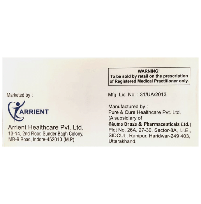 Manufacturer details:,                                   Marketer details:Arrient Healthcare Pvt Ltd | 112 M,Arcade Mahanir Nagar , Sarawali mumbai -401501