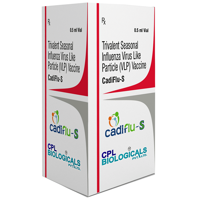 description:Cadiflu-S Vaccine helps protect you from influenza (flu). It works by exposing you to a small dose of the flu virus which helps your body to develop immunity against the disease. Vaccination will not treat an existing flu virus infection. Cadiflu-S Vaccine is given as an injection into a muscle by a doctor or nurse. It is usually given just before the cold season when the flu virus begins to increase. Normally, only one injection is required to protect you for a year. You should have the vaccination each year because different new strains of the flu virus emerge frequently and different vaccines are developed. It is especially important to have this vaccine if you are elderly or have chronic health problems such as diabetes, heart failure, kidney failure, or chronic obstructive pulmonary disease (COPD). It is also recommended for young children over 6 months of age.This vaccine can cause mild side effects, but it is better to get vaccinated than to become infected with flu. The most common side effects include headache, muscle pain, weakness, tiredness, bruising, joint pain, sweating, shivering, and pain or swelling at the vaccination site. They do not normally last very long. Consult your doctor if any of the side effects persist or worry you.Before having the injection, you should tell your doctor if you have an illness with a high temperature or if you have ever had an allergic reaction to a vaccine. Some other medicines may react with the flu vaccine so talk to your doctor about other medications you are taking as well. As with any vaccine, vaccination may not fully protect everybody, although it will reduce the symptoms of the flu if you get it. It will not prevent illness from avian flu (bird flu) or a common cold. Consult your doctor first if you are pregnant or breastfeeding.