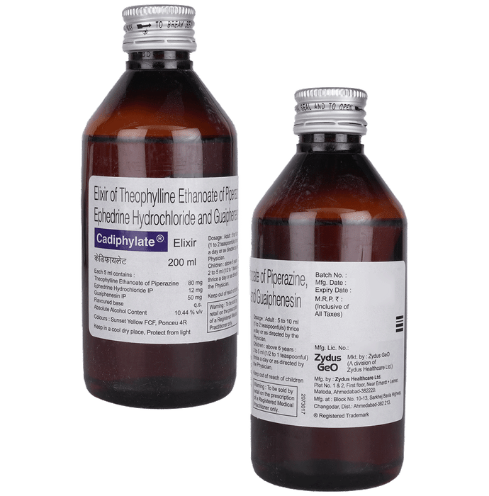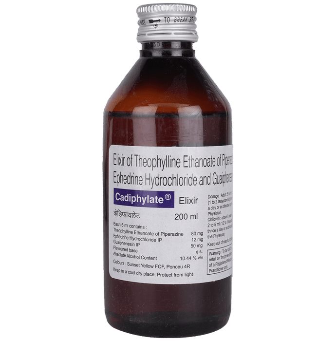 description:Cadiphylate Elixir is a combination medicine used in the treatment of cough. It clears away the windpipe by diluting the thick mucus (phlegm) for easy cough out. Cadiphylate Elixir is a prescription medicine and it is advised to take it as per the doctor’s advice. It can be taken with or without food, but it must be taken at a fixed time to ensure better efficacy. Do not consume more than the recommended dose, as this may have harmful effects on your body. If you miss a dose, take it as soon as you remember. The course of the treatment must be completed even if you feel better. Sudden discontinuation of the treatment may affect the potency of the medicine.Some common side effects of this medicine are nausea, vomiting, diarrhea, indigestion, etc. If any of the side effects get aggravated, you must consult your doctor immediately. If you experience any allergic reaction (rashes, itching, swelling, shortness of breath, etc.), you must seek immediate medical help.Before taking this medicine, you should tell your doctor if you are taking any medicines for any health condition. Pregnant or breastfeeding women should also consult with their doctor before taking it. Avoid drinking alcohol as it can cause excessive drowsiness with this medicine. It usually does not impair your ability to drive, but you should not drive if it makes you feel sleepy or dizzy. You must take adequate rest for a faster recovery, also take a healthy diet and drink plenty of water.